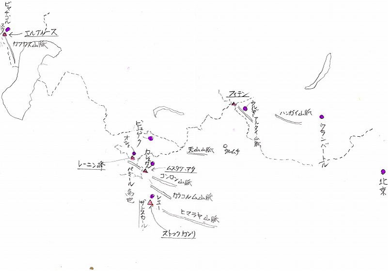 40 シルクロード シルクロードへの関心は高かったが、 西欧と全く異なる、不気味な社会体制である、 公共交通が発達していない、 治安が悪そうである、 言葉が通じない、 などから敬遠していた。特に自己手配・自由行動が基本の私には合わない。 しかし、関心が不安材料に勝り、ウェッブ情報から信頼できそうなガイド、ガイド会社を見つけ、 メールを何度も交換してガイド、ガイド会社と契約し、次の5つに出かけた。 ガイド、ガイド会社の管理の外に踏み出さなかったので、何ら問題はなかった。 これら5つのweb記事には山以外の風景が比較的多く含まれているの、頁を捲っていただきたい、 ![]() 昭文社「なるほど知図帳(のランベルト正規方眼図法 投影中心)」をコピーし作成している。